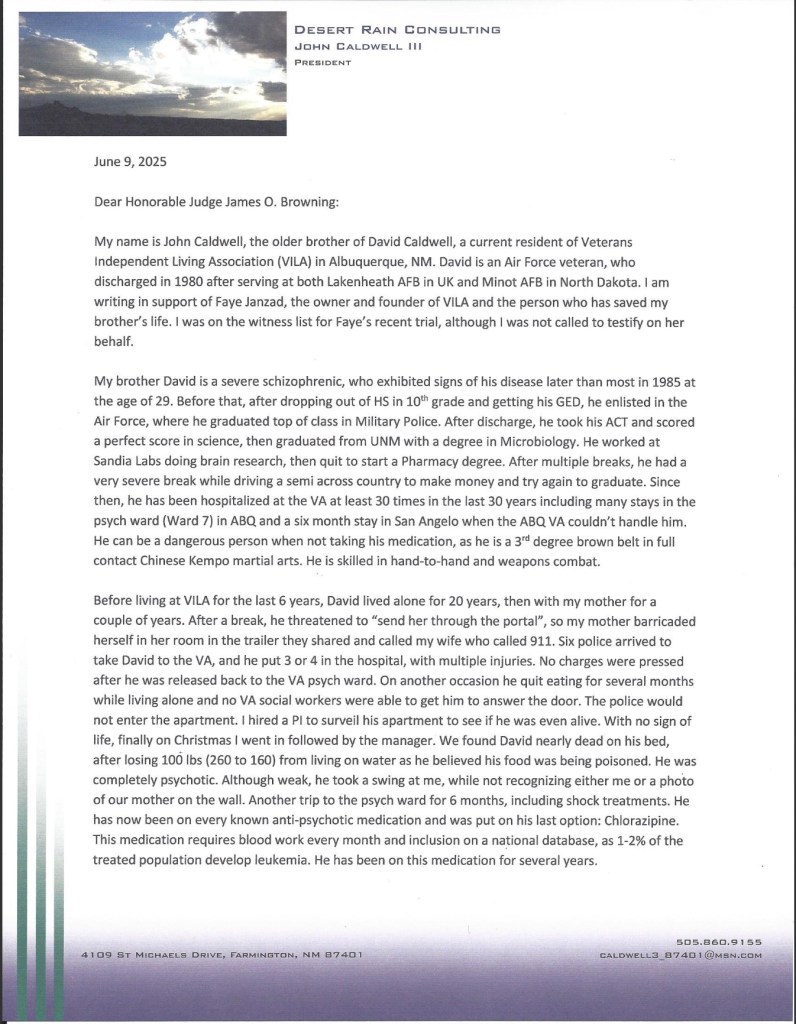 My name is John Caldwell, the older brother of David Caldwell, a current resident of Veterans Independent Living Association (VILA) in Albuquerque, NM. David is an Air Force veteran, who discharged in 1980 after serving at both Lakenheath AFB in UK and Minot AFB in North Dakota. I am writing in support of Faye Janzad, the owner and founder of VILA and the person who has saved my brother’s life. I was on the witness list for Faye’s recent trial, although I was not called to testify on her behalf.