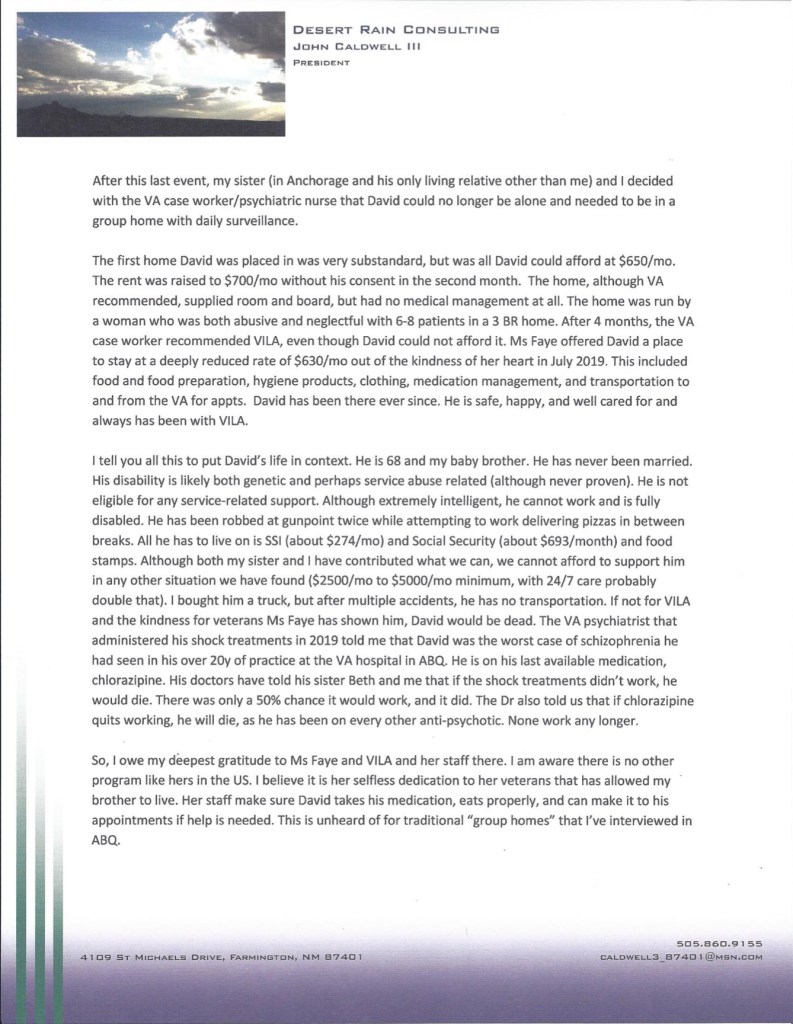 So, I owe my deepest gratitude to Ms. Faye and VILA and her staff there. I am aware there is no other program like hers in the US. I believe it is her selfless dedication to her veterans that has allowed my brother to live. Her staff make sure David takes his medication, eats properly, and can make it to his appointments if help is needed. This is unheard of for traditional “group homes” that I’ve interviewed in ABQ.